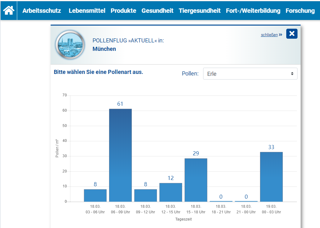 德國(guó)Helmut Hund公司研發(fā)的全自動(dòng)花粉監(jiān)測(cè)系統(tǒng)BAA500可快速、準(zhǔn)確的對(duì)花粉種類進(jìn)行精確識(shí)別和實(shí)時(shí)濃度監(jiān)測(cè),基于BAA500巴伐利亞國(guó)家衛(wèi)生和食品安全管理局建成電子花粉信息網(wǎng)(簡(jiǎn)稱ePIN),監(jiān)測(cè)該州其下八個(gè)地區(qū)的花粉含量。ePIN監(jiān)測(cè)的花粉種類主要有榛子、黑榿木、普通灰、樺木、草、黑麥、艾蒿和豚草。ePIN數(shù)據(jù)對(duì)公眾開(kāi)放,不同種類的花粉濃度實(shí)時(shí)數(shù)據(jù)可以通過(guò)網(wǎng)站直接查看: