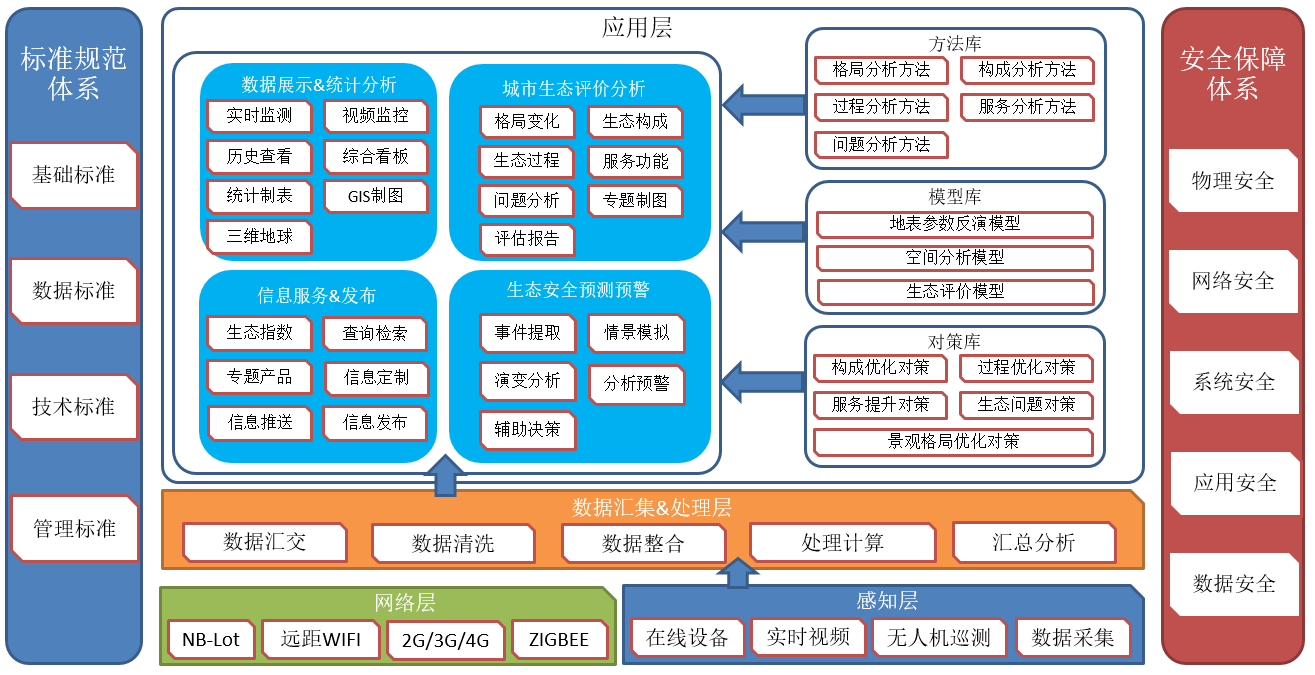 城市生態(tài)監(jiān)測分析預警平臺重點關注城市生態(tài)的信息收集、數(shù)據(jù)跟蹤分析、生態(tài)綜合評價、安全預測預警和數(shù)據(jù)共享。